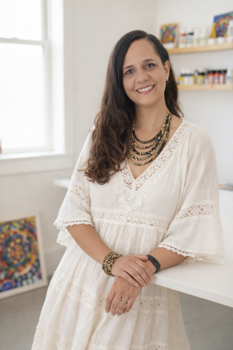 Sou uma artista mixed media brasileira, nascida na Bahia, com alma inquieta e coração viajante. Vivi oito anos no Canadá e hoje exploro novas paisagens e inspirações em Portugal. Minha jornada artística nasceu da coragem de abraçar minha essência depois de anos silenciando minha própria voz criativa.